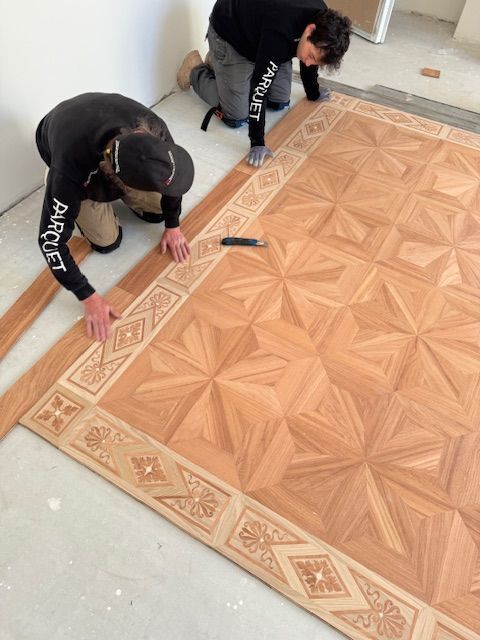 Prima fase Posa a secco e dopo un accurato controllo di uniformità il parquet viene numerato per ogni singolo pezzo, rimosso e riposizionato con la seconda posa utilizzando collanti bicomponenti/silanica